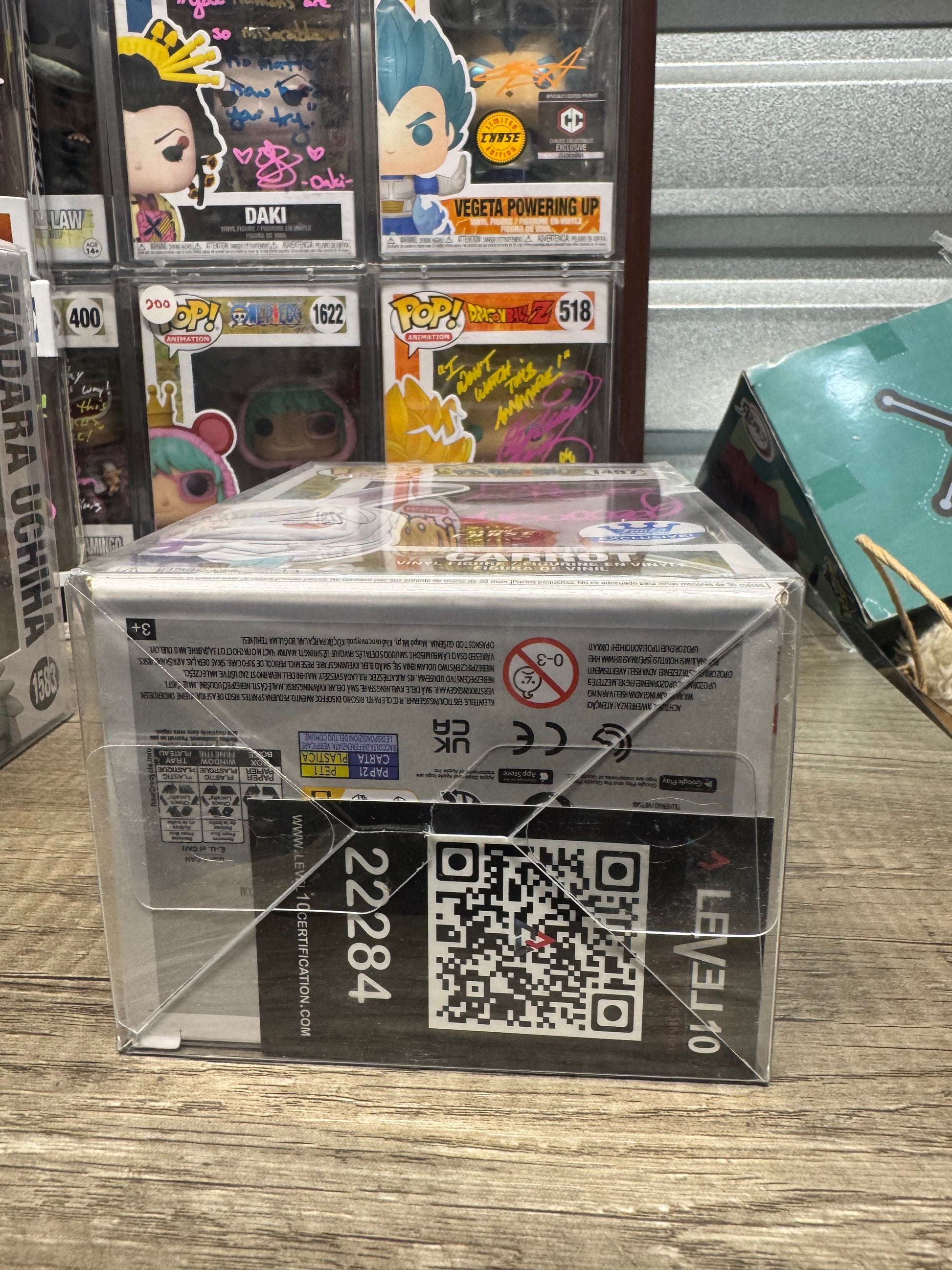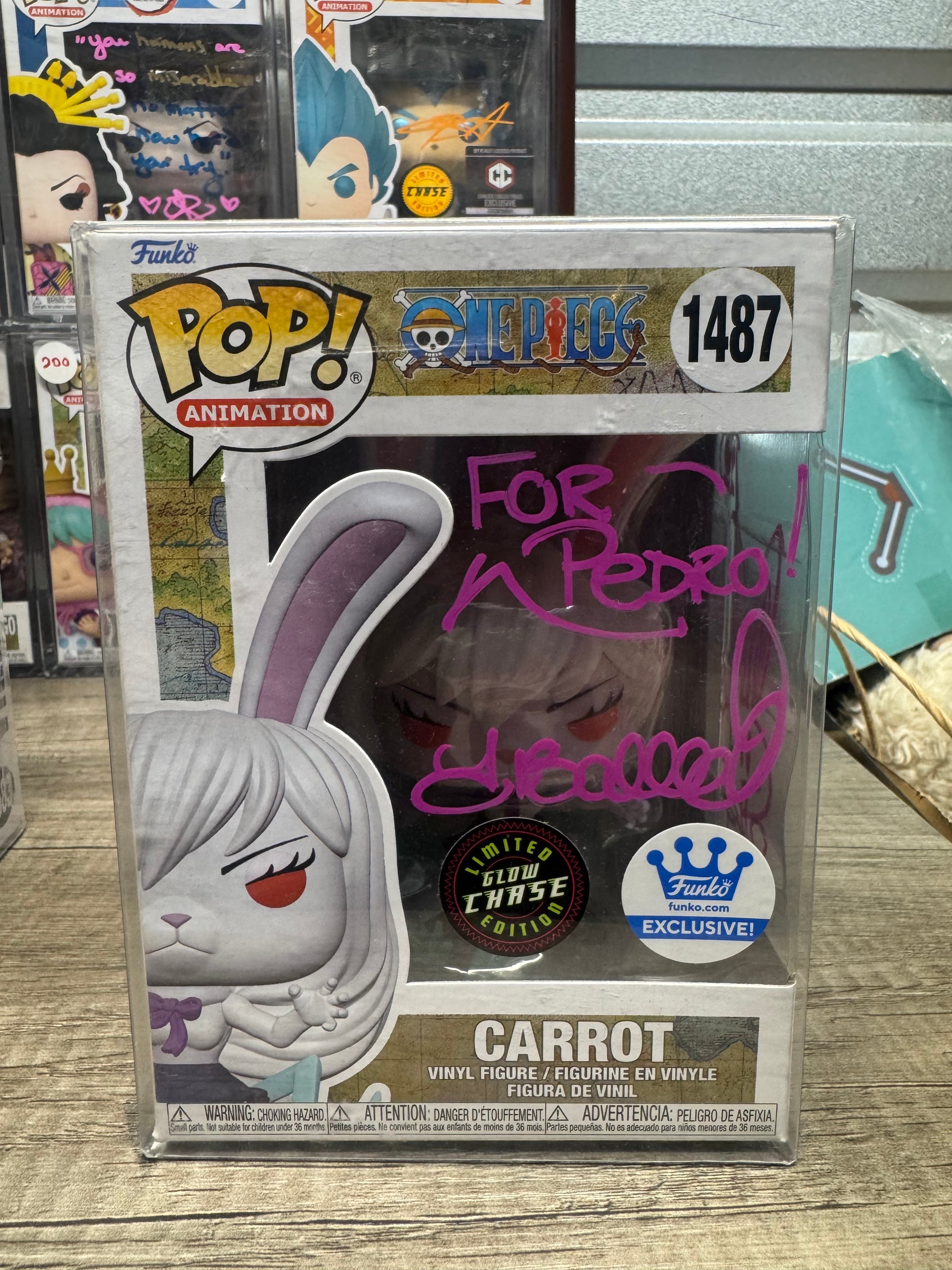 Authentic Funko Pop collectible signed by Carrot's voice actor Tia Ballard. Includes protective display box and Certificate of Authenticity. A must-have for any One Piece fan or Funko collector!